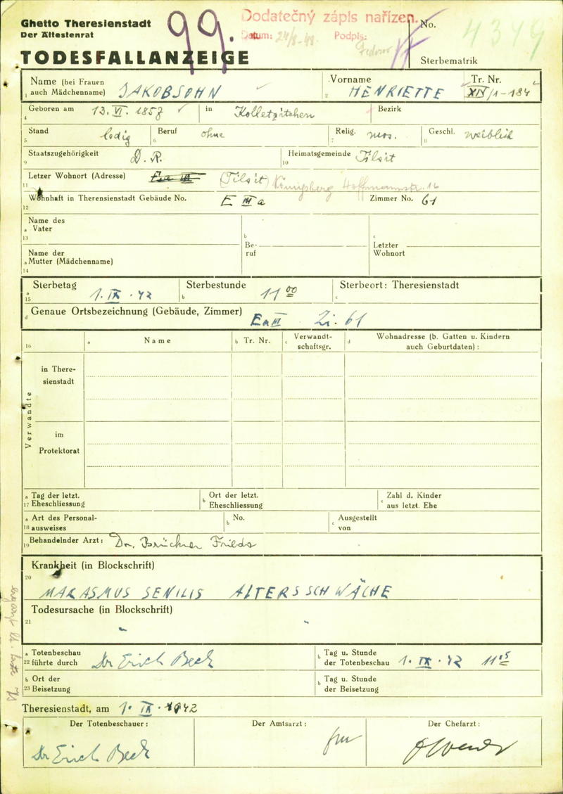 Jakobsohn Henriette: Oznámení o úmrtí, ghetto Terezín