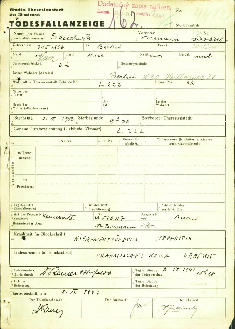 Bauchwitz Hermann: Oznámení o úmrtí, ghetto Terezín