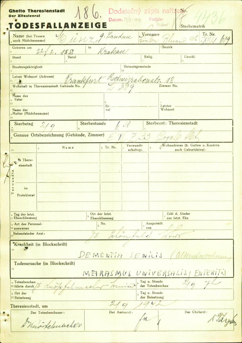 Münz Liebe Blume: Oznámení o úmrtí, ghetto Terezín