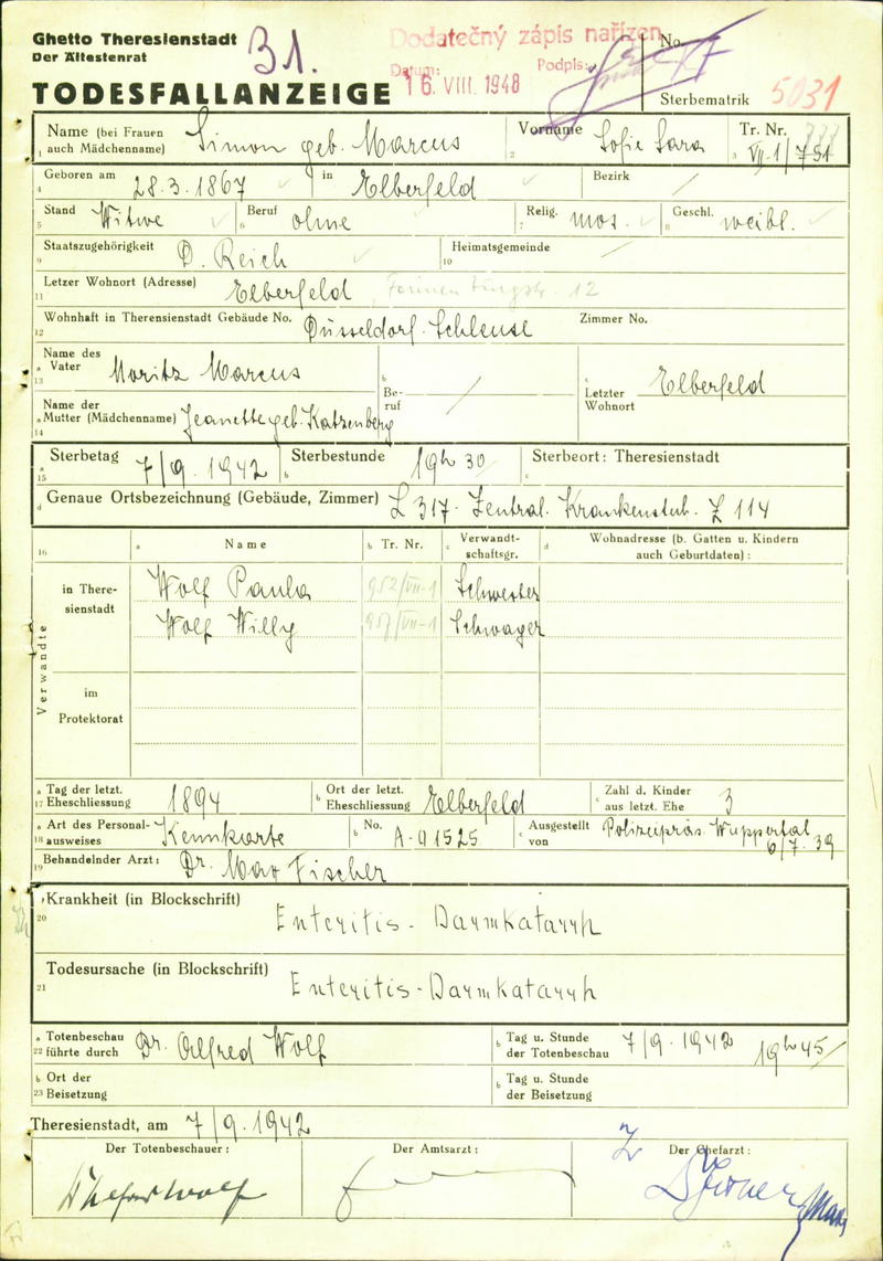 Simon Sophie: Oznámení o úmrtí, ghetto Terezín