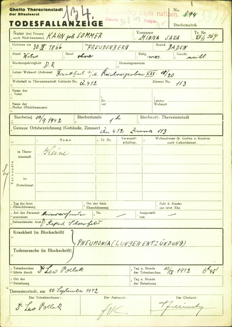 Kahn Minna: Oznámení o úmrtí, ghetto Terezín