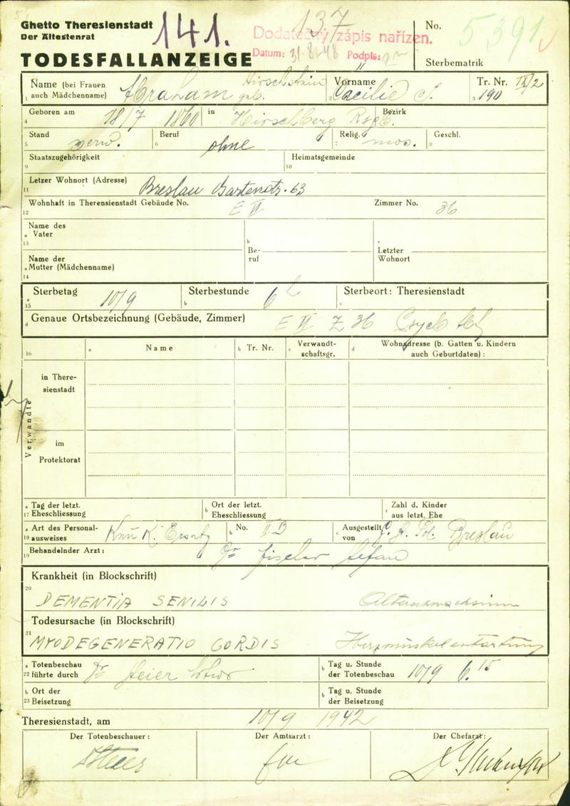 Abraham Cäcilie: Oznámení o úmrtí, ghetto Terezín