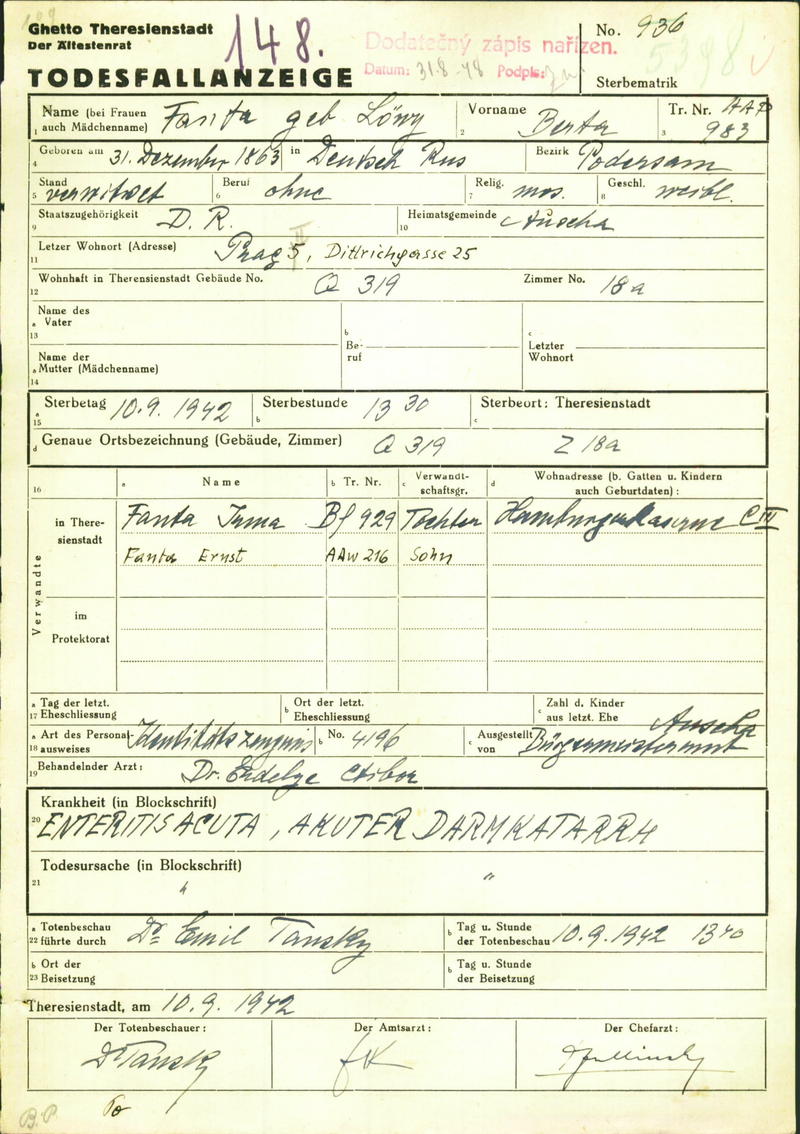 Fantová Berta: Oznámení o úmrtí, ghetto Terezín