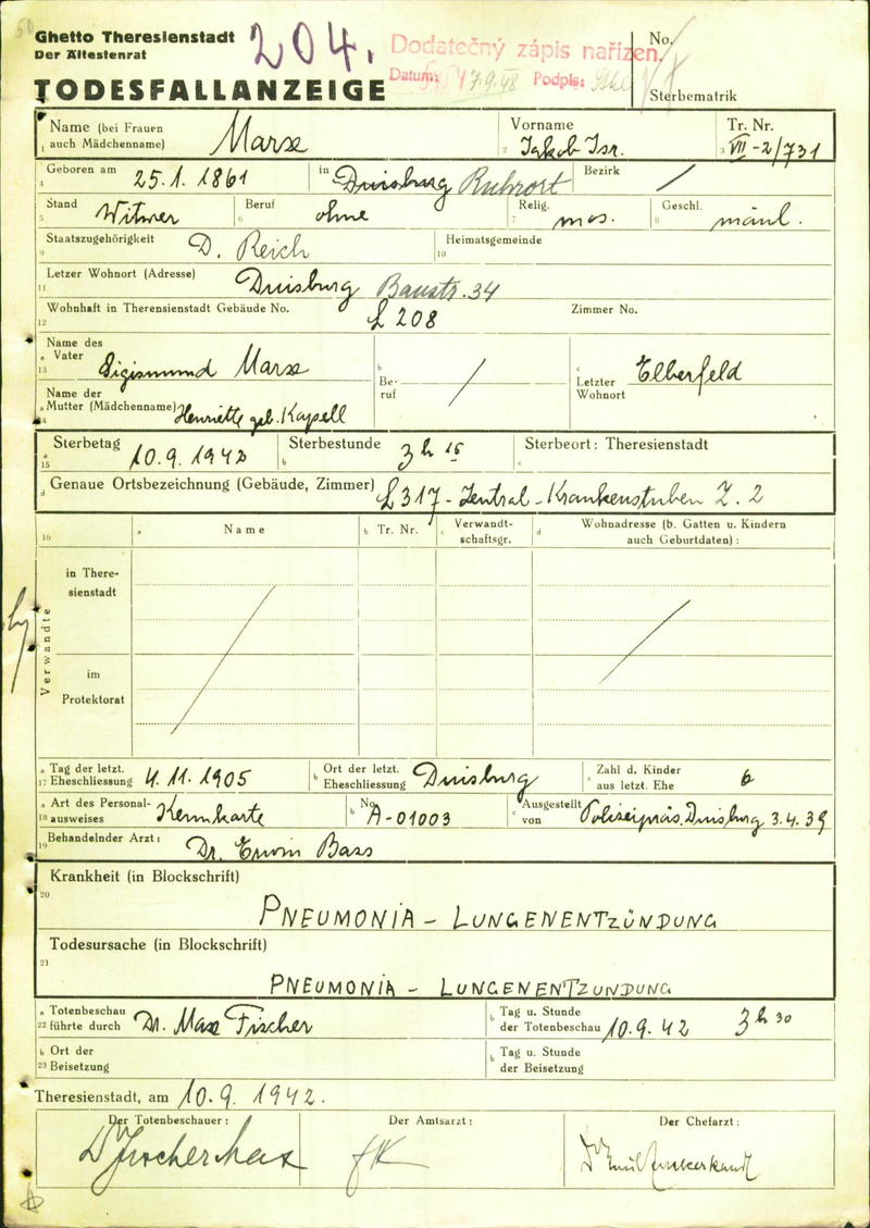 Marx Jakob: Oznámení o úmrtí, ghetto Terezín