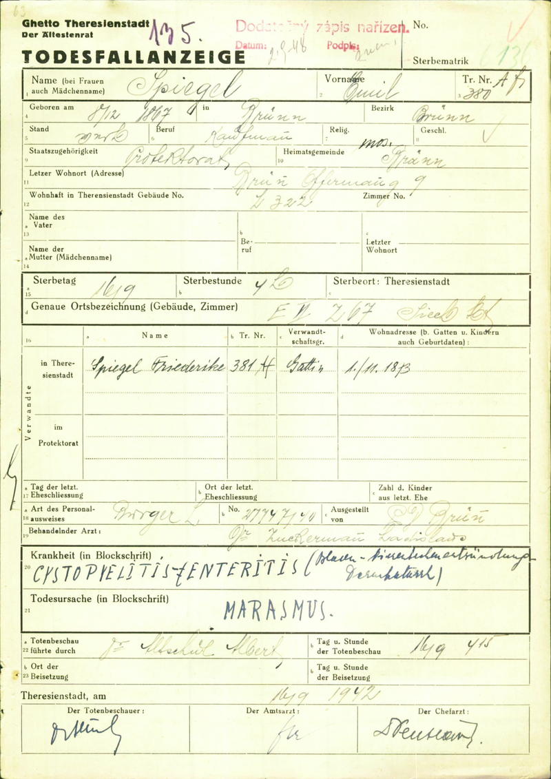 Spiegel Emil: Oznámení o úmrtí, ghetto Terezín