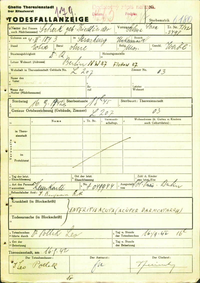 Scherk Selma: Oznámení o úmrtí, ghetto Terezín