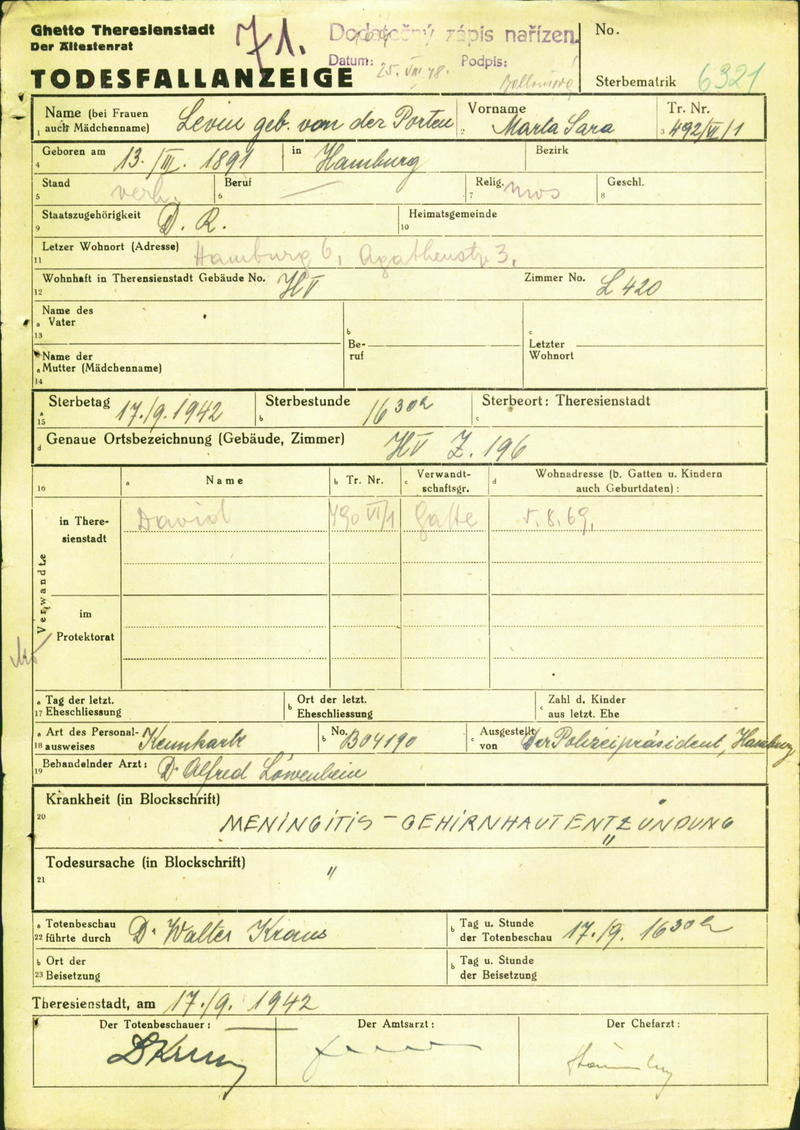 Levin Marta: Oznámení o úmrtí, ghetto Terezín