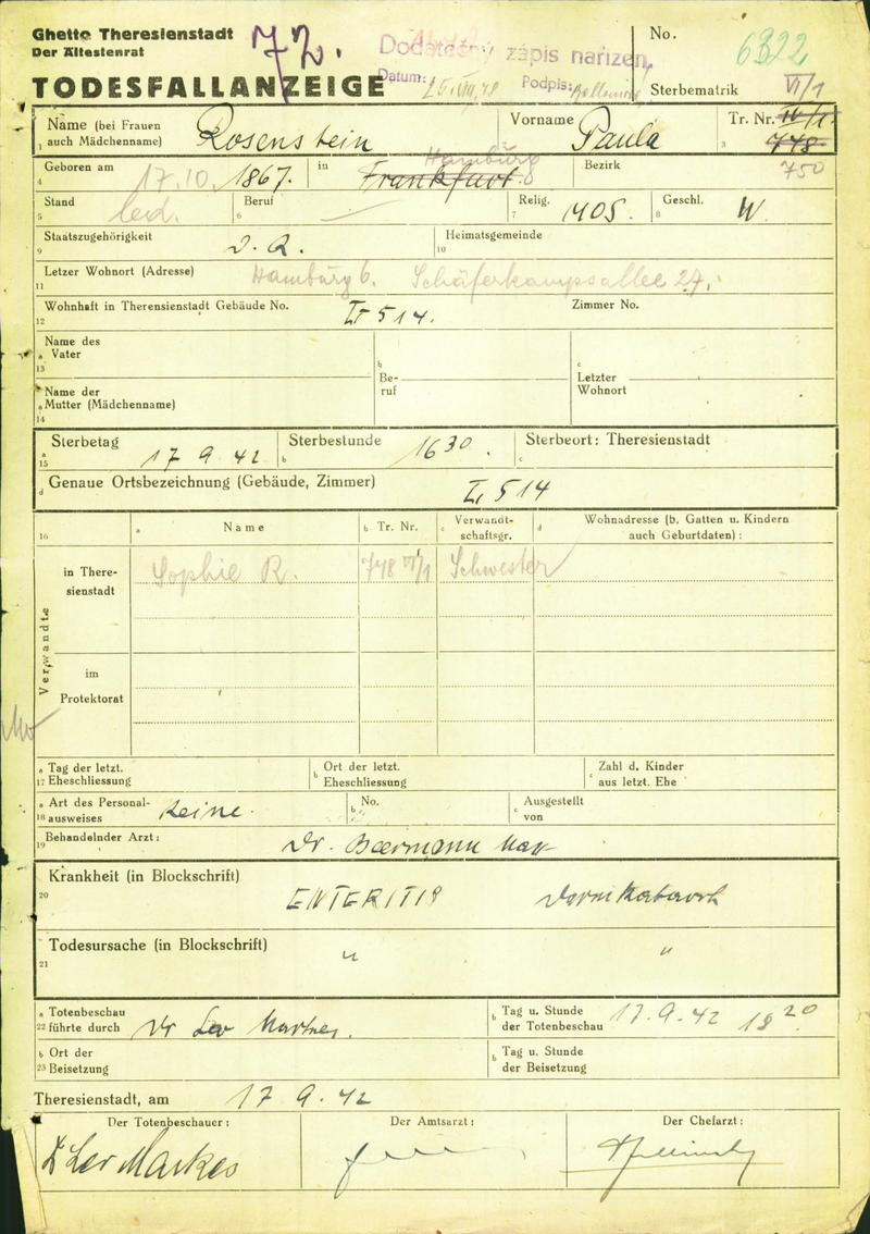 Rosenstein Paula: Oznámení o úmrtí, ghetto Terezín