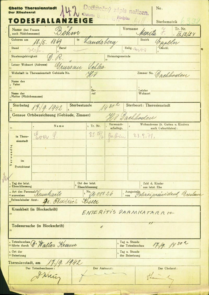 Böhm Moritz: Oznámení o úmrtí, ghetto Terezín