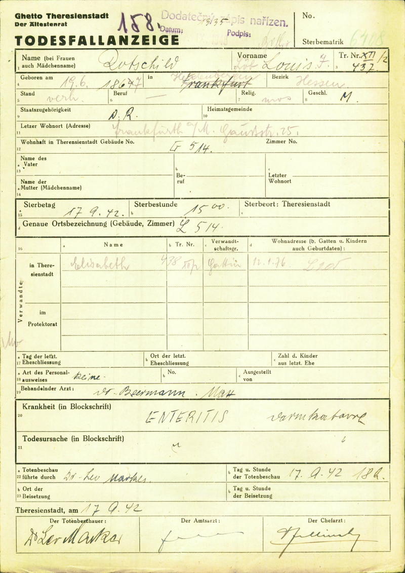Rothschild Louis: Oznámení o úmrtí, ghetto Terezín
