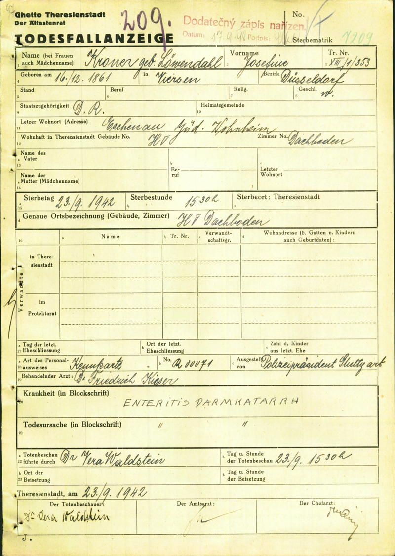 Kroner Josephine: Oznámení o úmrtí, ghetto Terezín