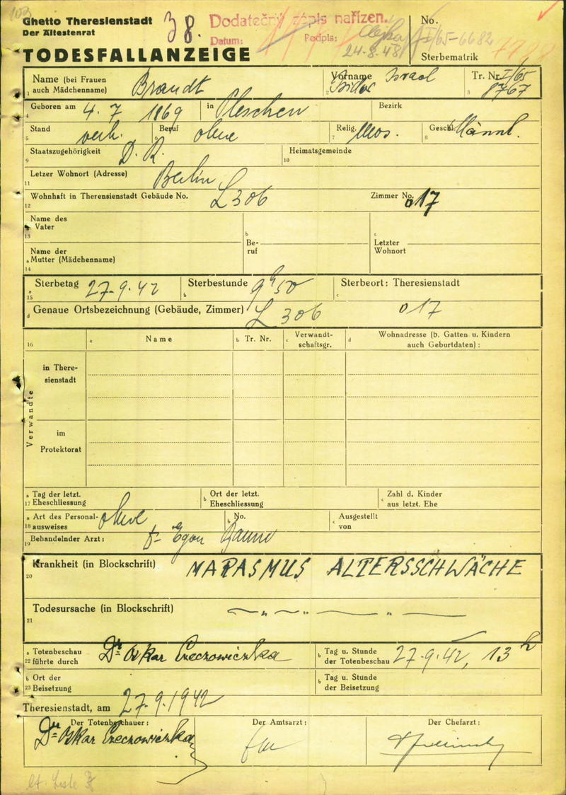 Brandt Isidor: Oznámení o úmrtí, ghetto Terezín