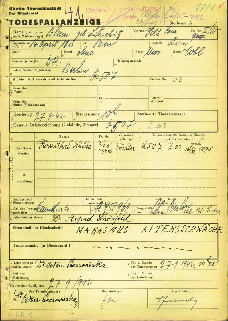 Blum Ida: Oznámení o úmrtí, ghetto Terezín