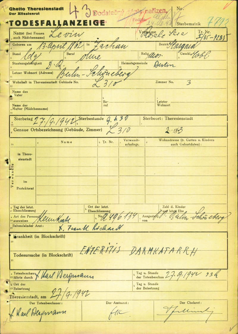 Levin Rosalie: Oznámení o úmrtí, ghetto Terezín
