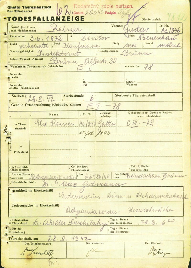 Reiner Gustav: Oznámení o úmrtí, ghetto Terezín