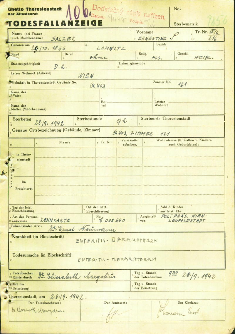 Salzer Ernestine: Oznámení o úmrtí, ghetto Terezín