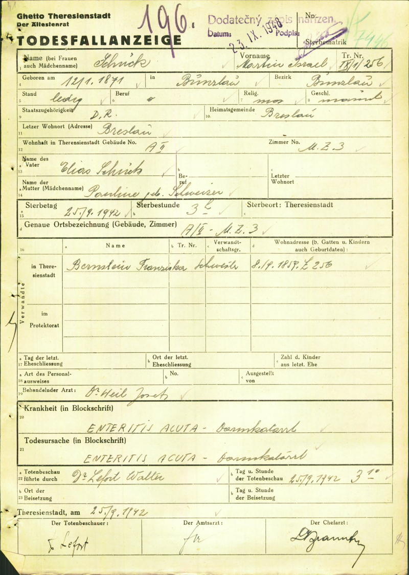 Schück Martin: Oznámení o úmrtí, ghetto Terezín
