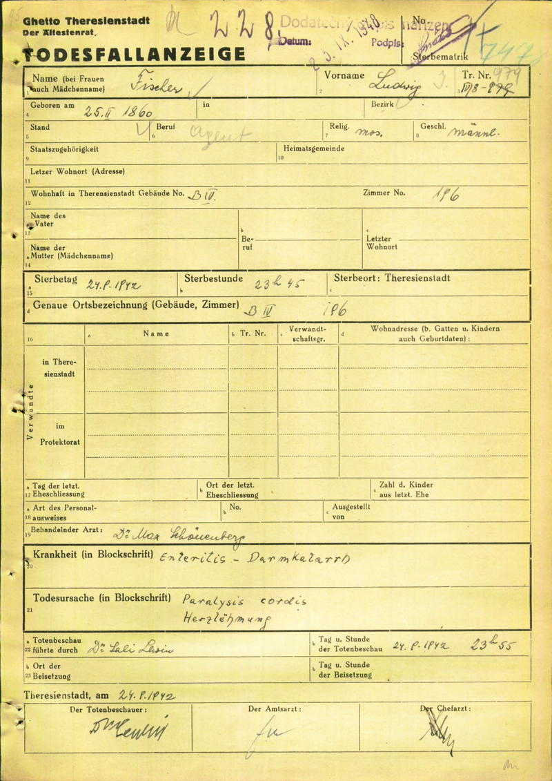 Fischer Ludwig: Oznámení o úmrtí, ghetto Terezín