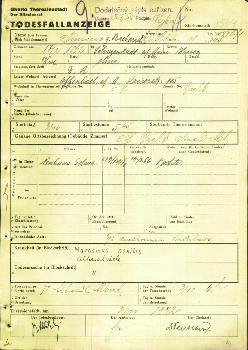 Simons Mathilde: Oznámení o úmrtí, ghetto Terezín