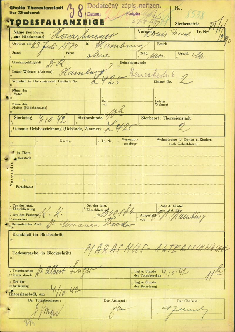 Haarburger Louis: Oznámení o úmrtí, ghetto Terezín