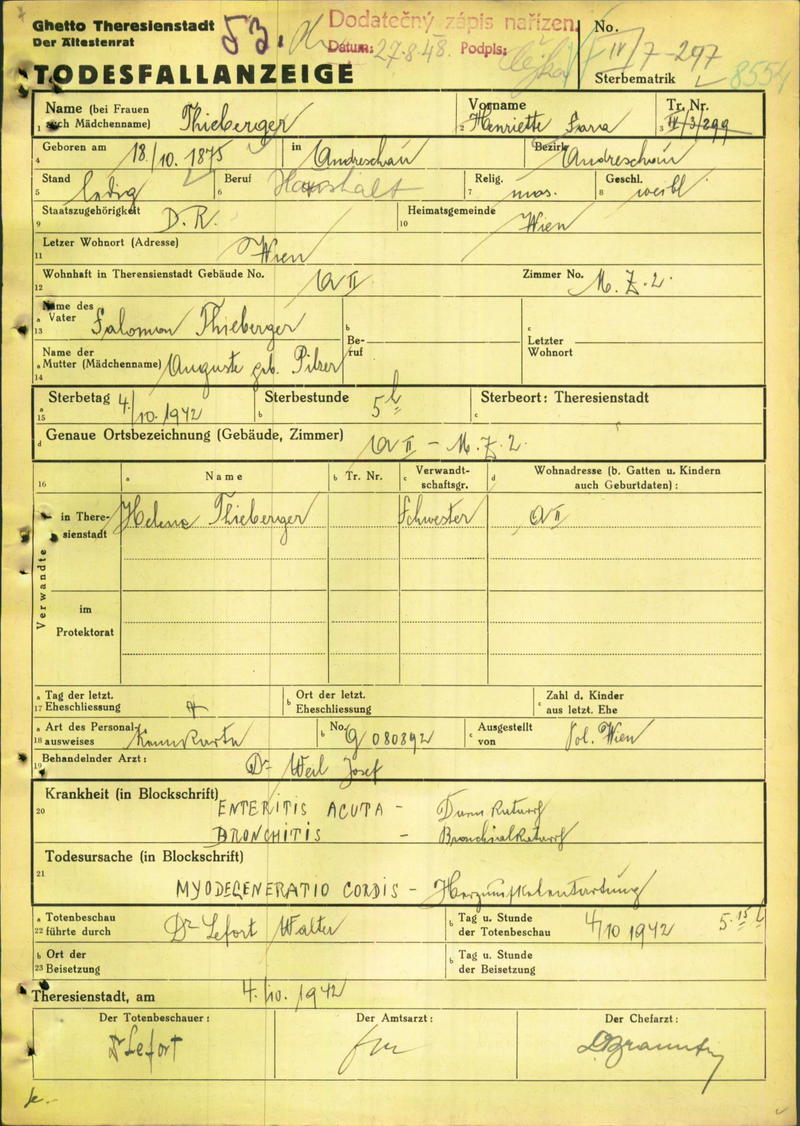 Thieberger Henriette: Oznámení o úmrtí, ghetto Terezín