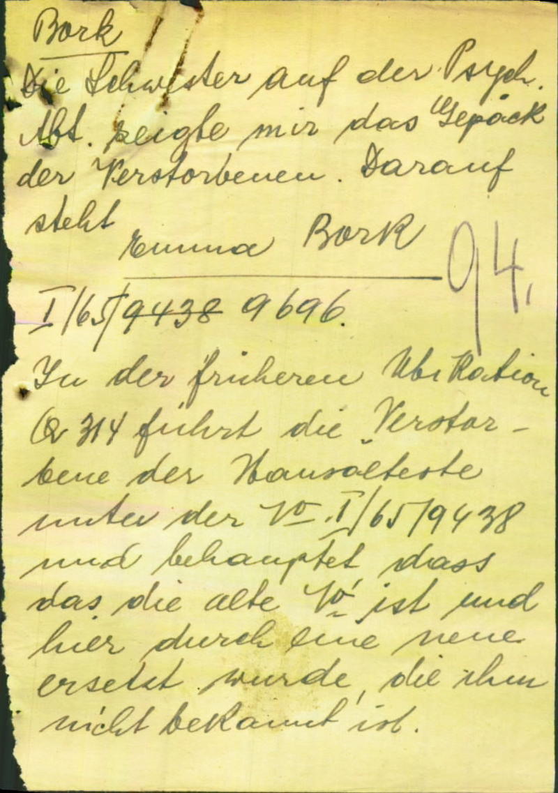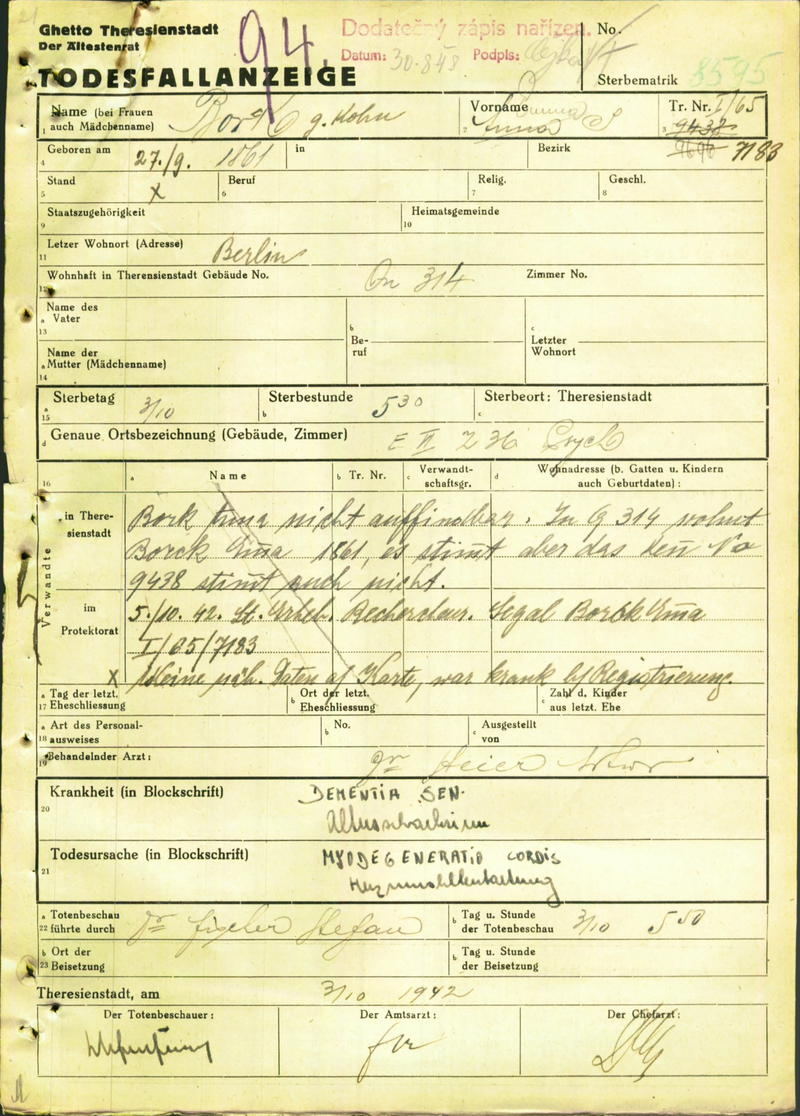 Borck Emma: Oznámení o úmrtí, ghetto Terezín