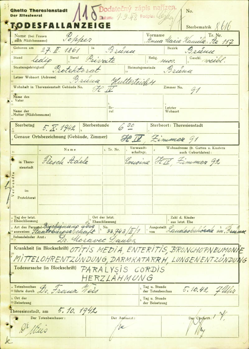 Popperová Anna: Oznámení o úmrtí, ghetto Terezín