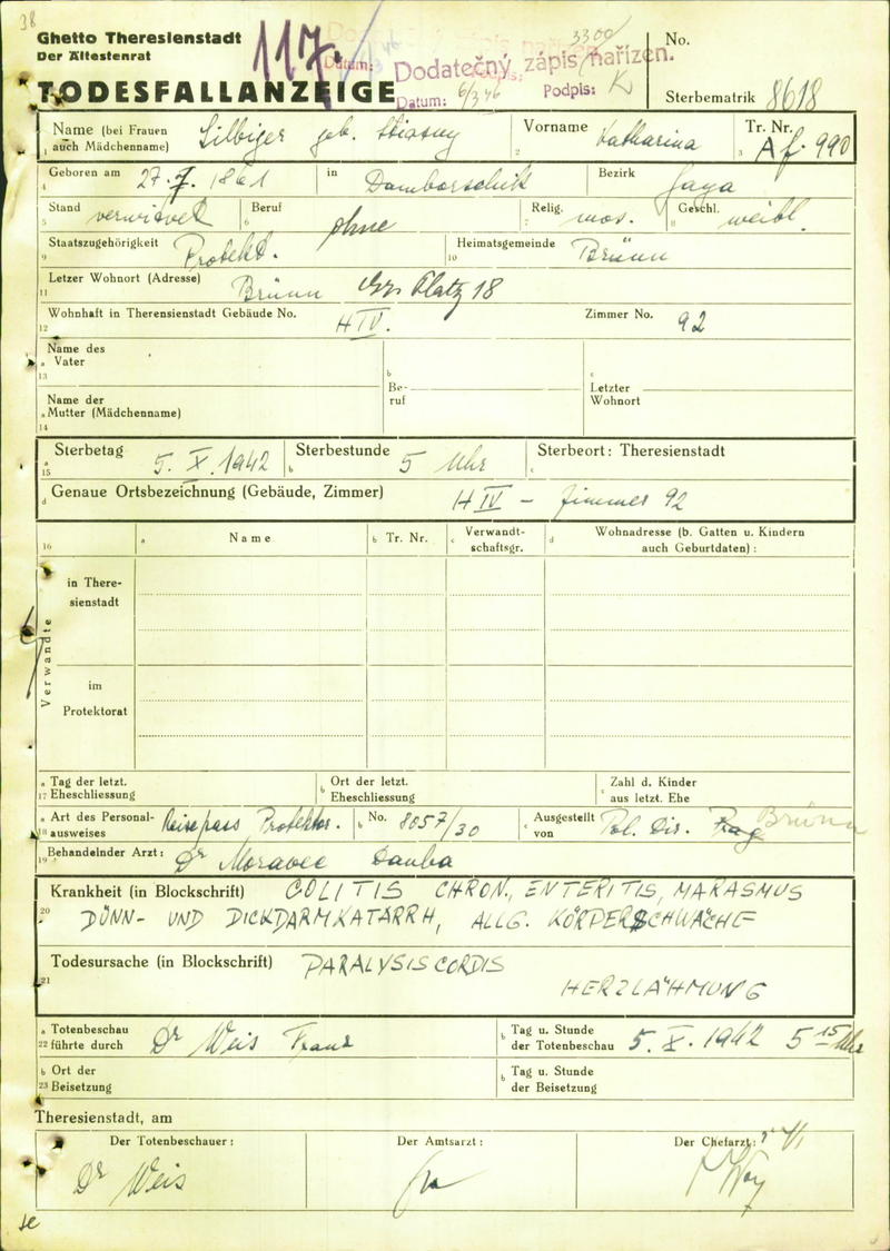 Silbigerová Kateřina: Oznámení o úmrtí, ghetto Terezín