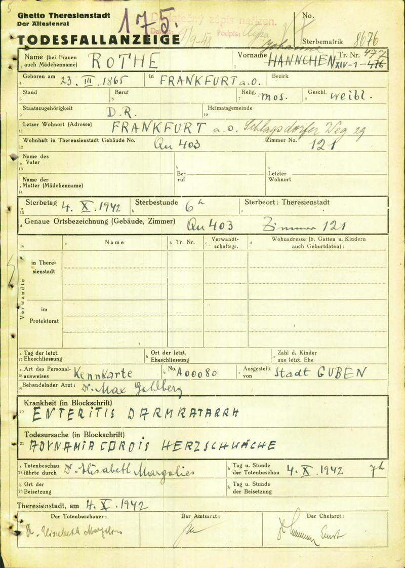 Rothe Johanna: Oznámení o úmrtí, ghetto Terezín