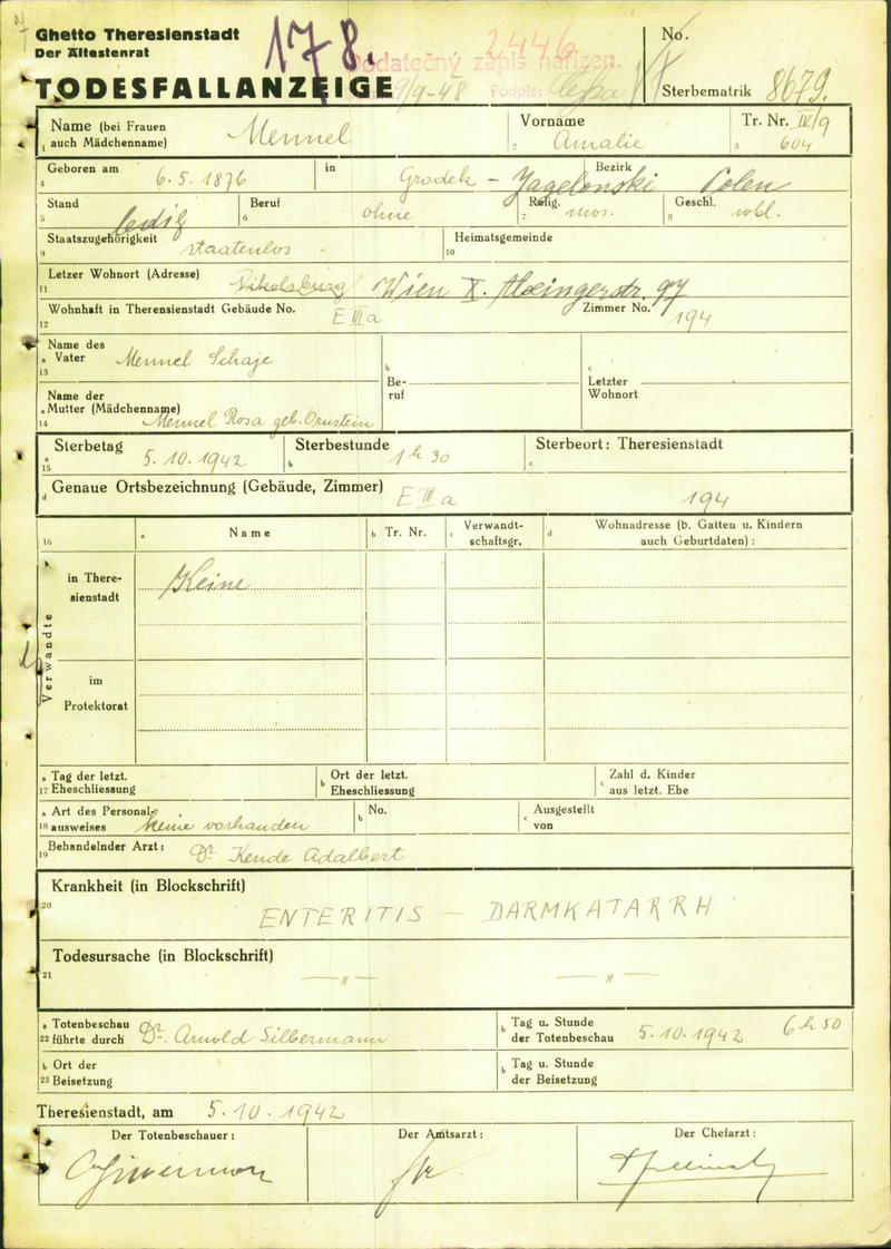 Mennel Amalie: Oznámení o úmrtí, ghetto Terezín