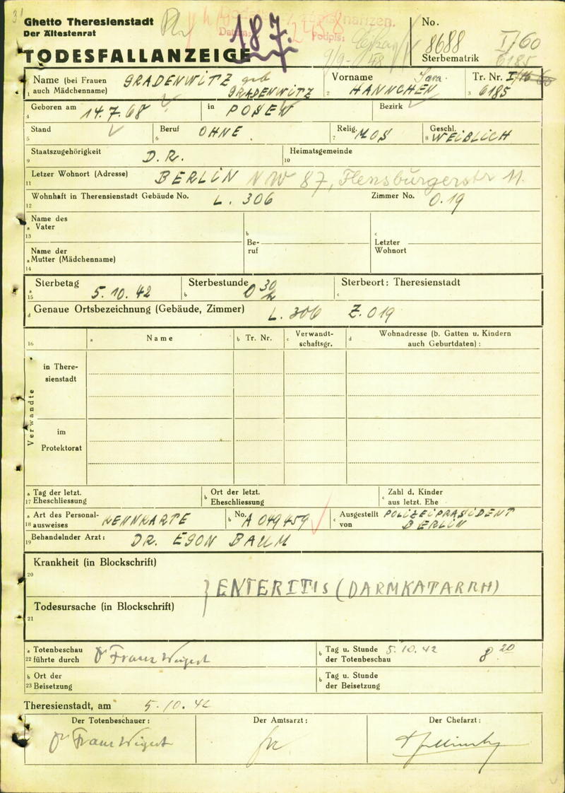 Gradenwitz Hannchen: Oznámení o úmrtí, ghetto Terezín