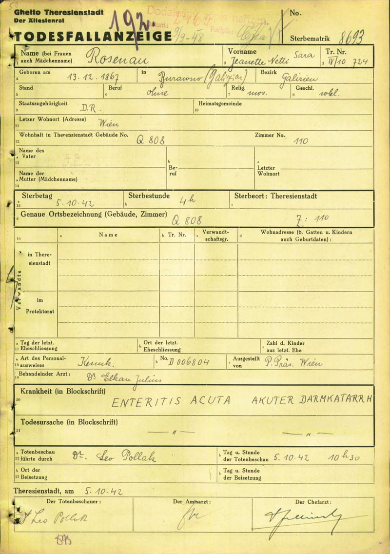 Rosenau Jeanette: Oznámení o úmrtí, ghetto Terezín