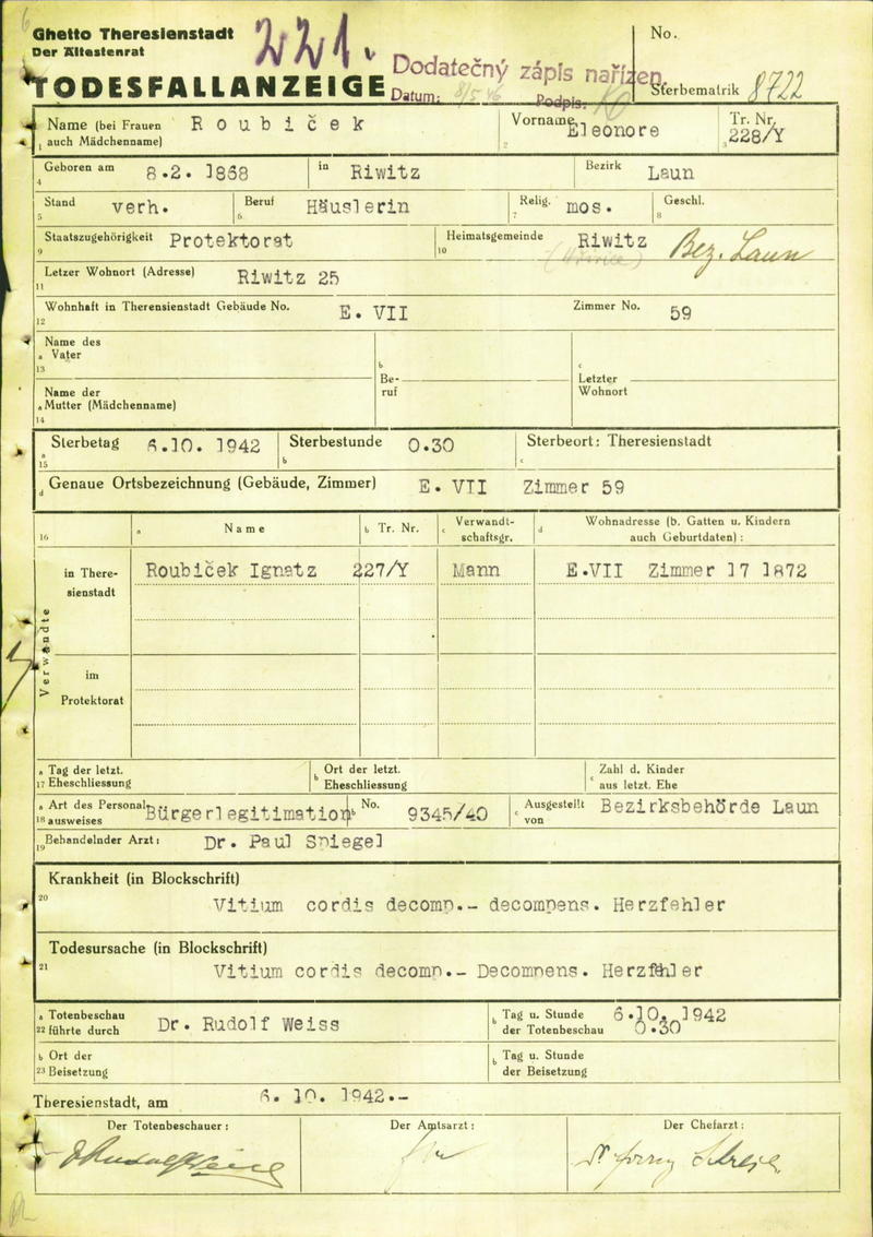 Roubičková Eleonora: Oznámení o úmrtí, ghetto Terezín