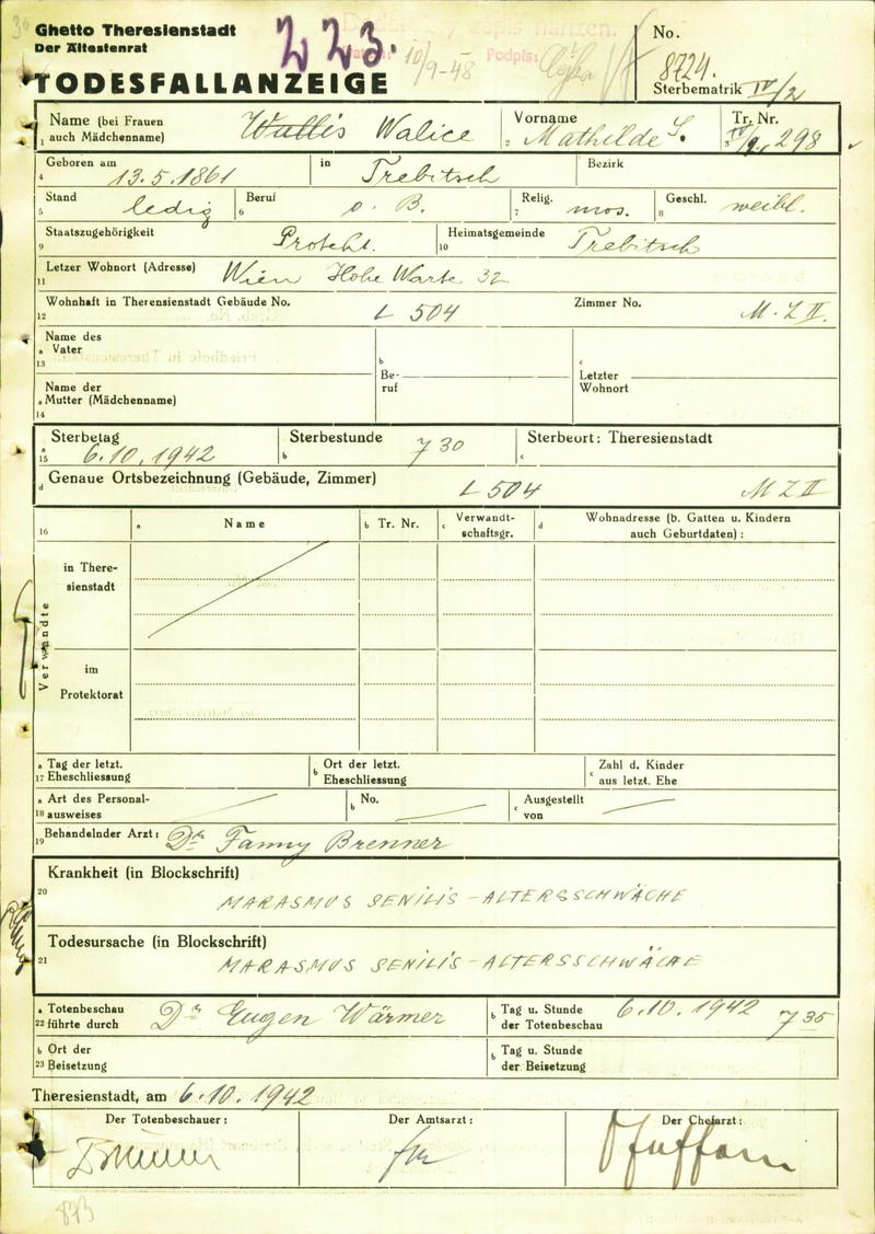 Wallis Mathilde: Oznámení o úmrtí, ghetto Terezín