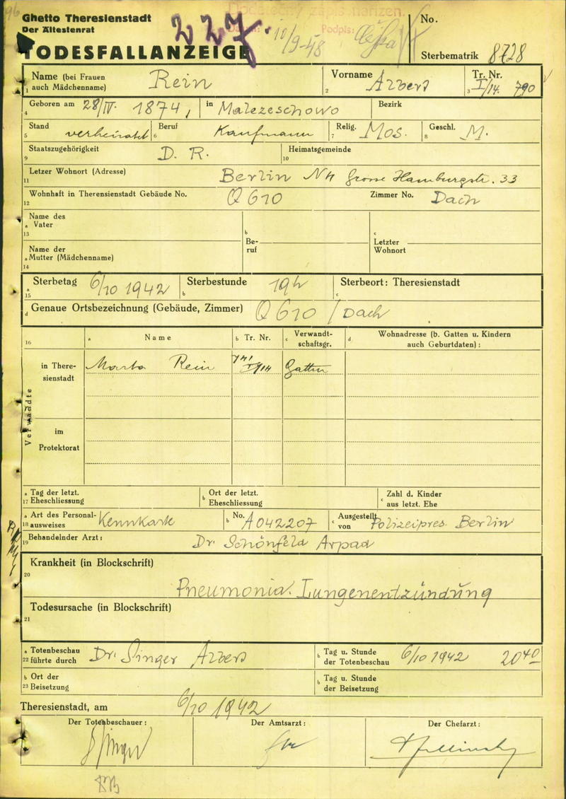 Rein Albert: Oznámení o úmrtí, ghetto Terezín