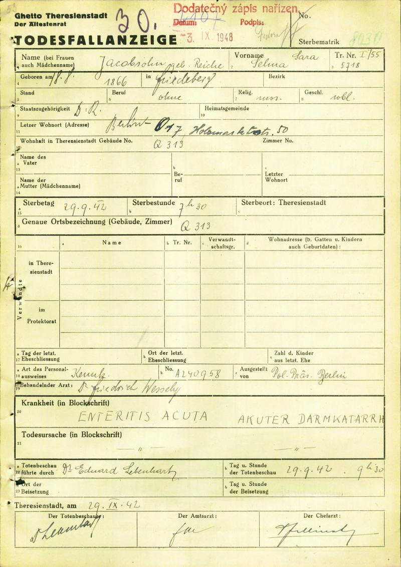 Jacobsohn Selma: Oznámení o úmrtí, ghetto Terezín