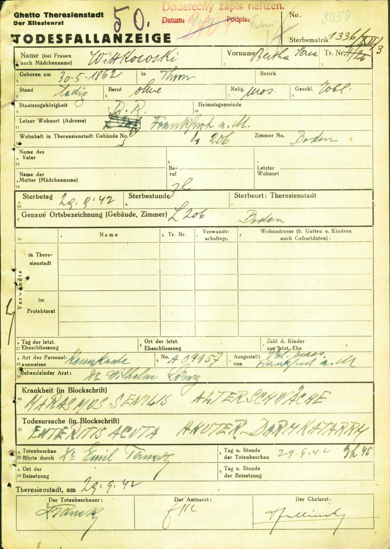 Wittkowski Bertha: Oznámení o úmrtí, ghetto Terezín