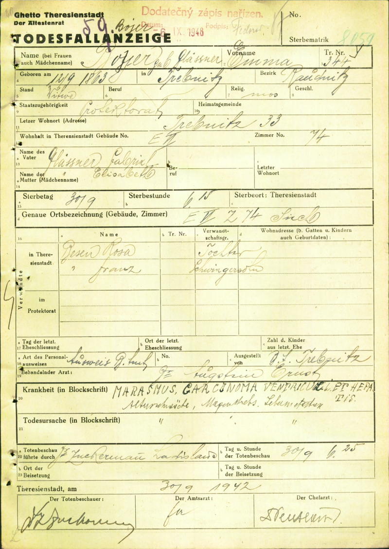 Bojerová Emma: Oznámení o úmrtí, ghetto Terezín