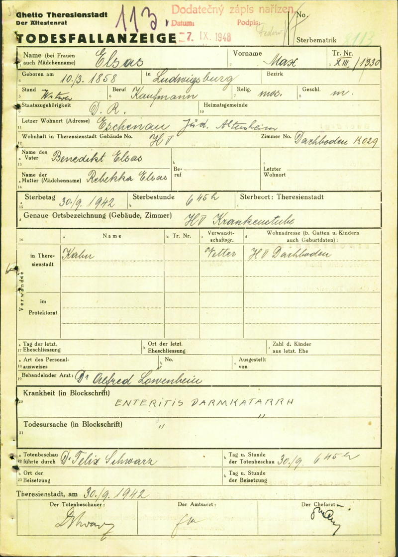 Elsas Max: Oznámení o úmrtí, ghetto Terezín