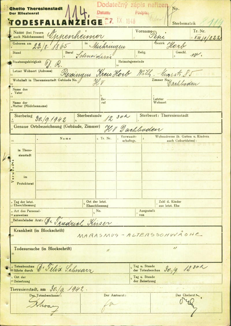 Oppenheimer Peppi: Oznámení o úmrtí, ghetto Terezín