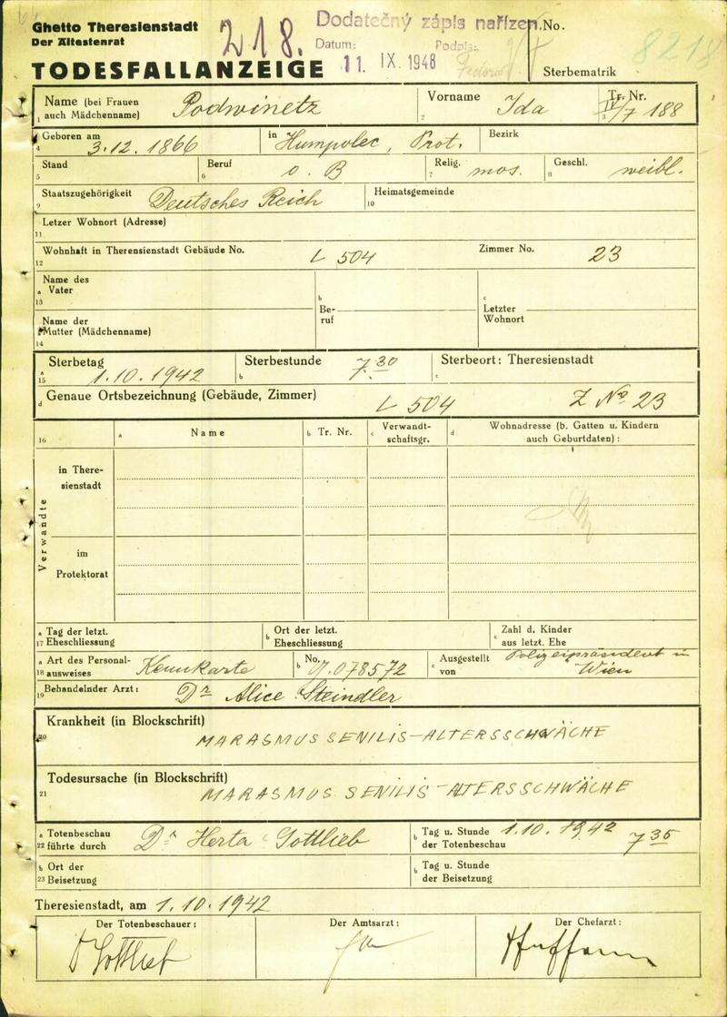 Podwinetz Ida: Oznámení o úmrtí, ghetto Terezín