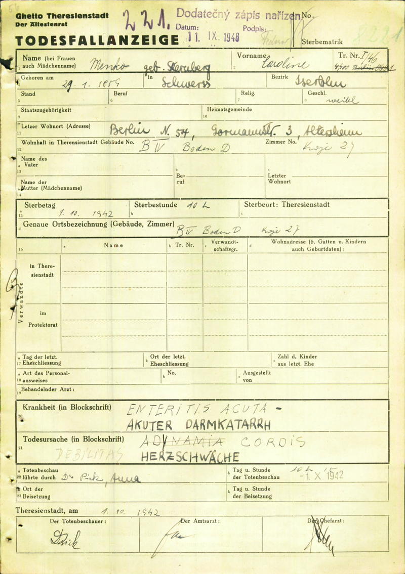Menko Karoline: Oznámení o úmrtí, ghetto Terezín