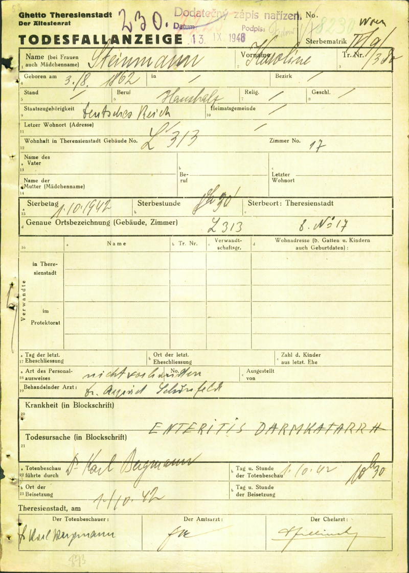 Steinmann Karoline: Oznámení o úmrtí, ghetto Terezín