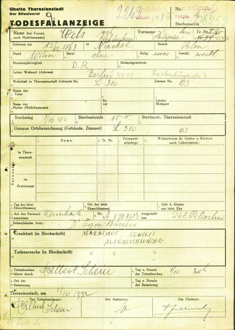 Wels Philippine: Oznámení o úmrtí, ghetto Terezín