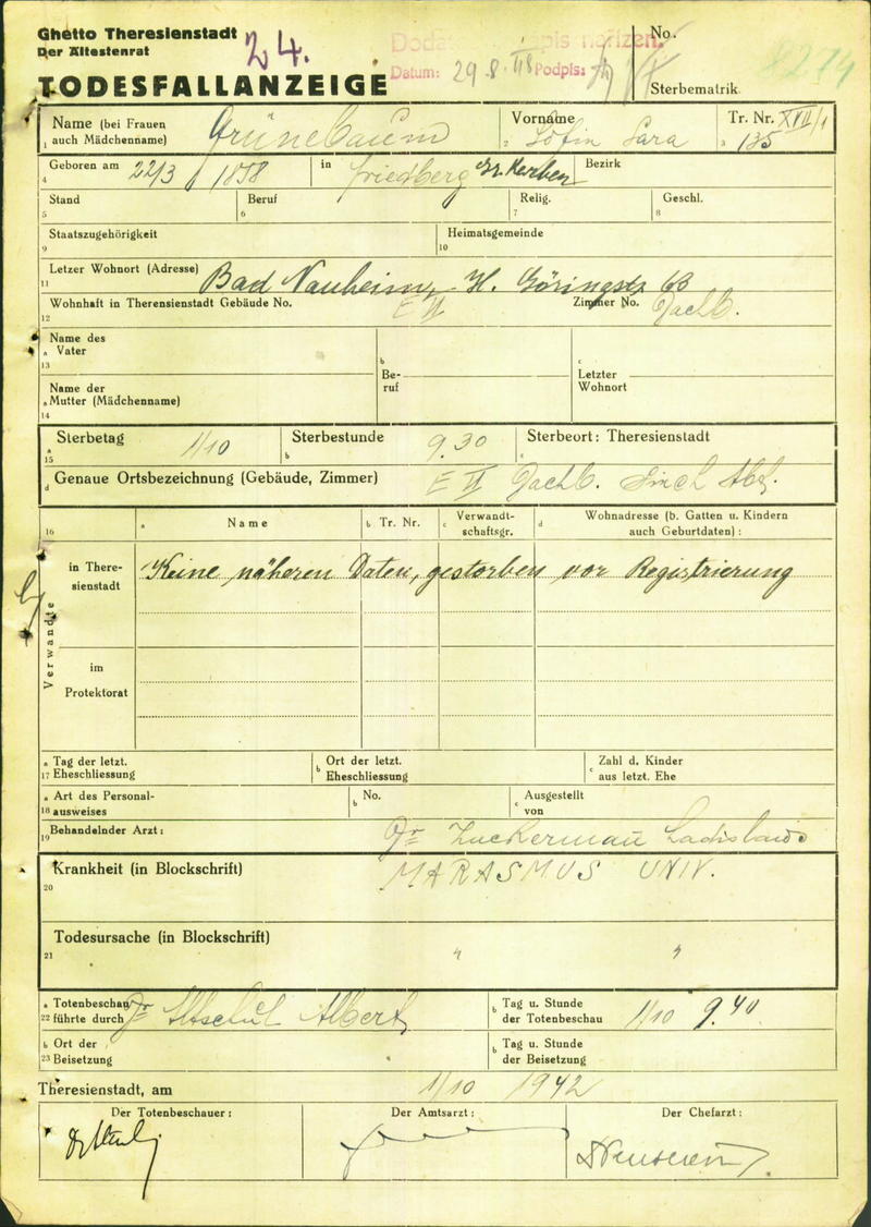 Grünebaum Sofie: Oznámení o úmrtí, ghetto Terezín