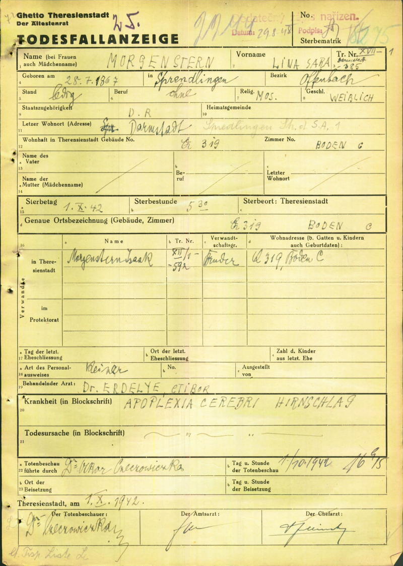 Morgenstern Lina: Oznámení o úmrtí, ghetto Terezín