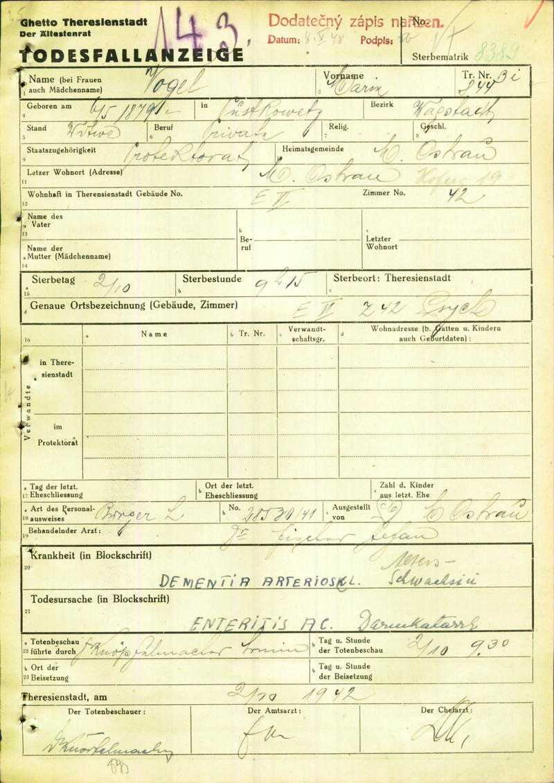 Vogelová Marie: Oznámení o úmrtí, ghetto Terezín