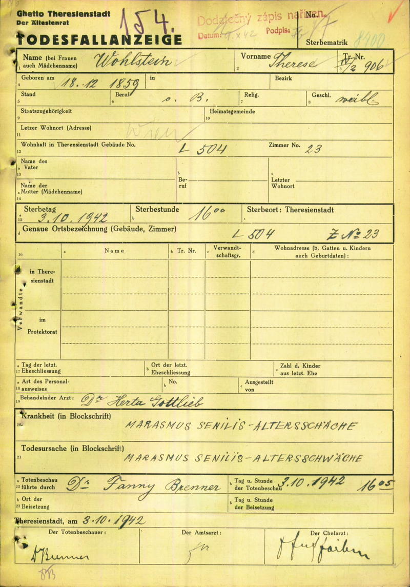 Wohlstein Resi: Oznámení o úmrtí, ghetto Terezín