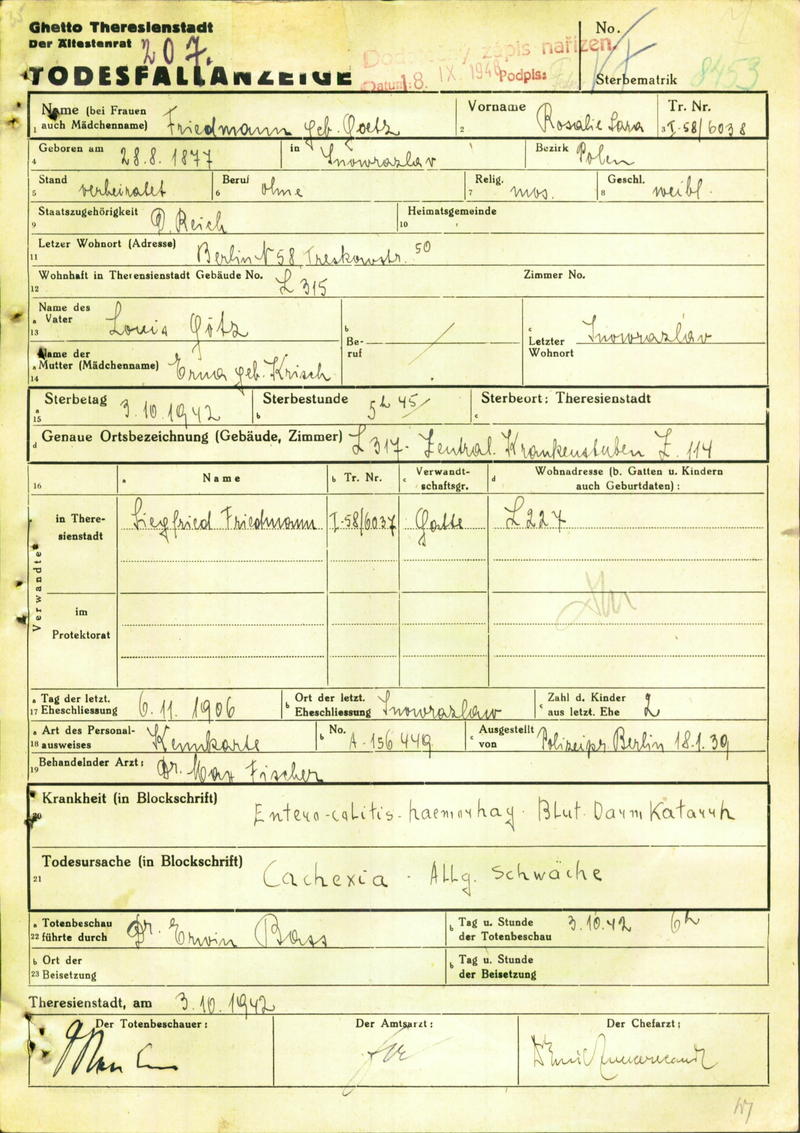 Friedmann Rosalie: Oznámení o úmrtí, ghetto Terezín