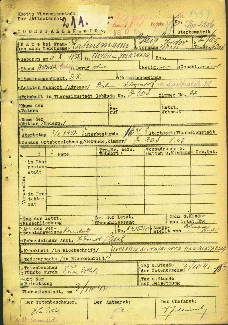 Kahnemann Isidor: Oznámení o úmrtí, ghetto Terezín